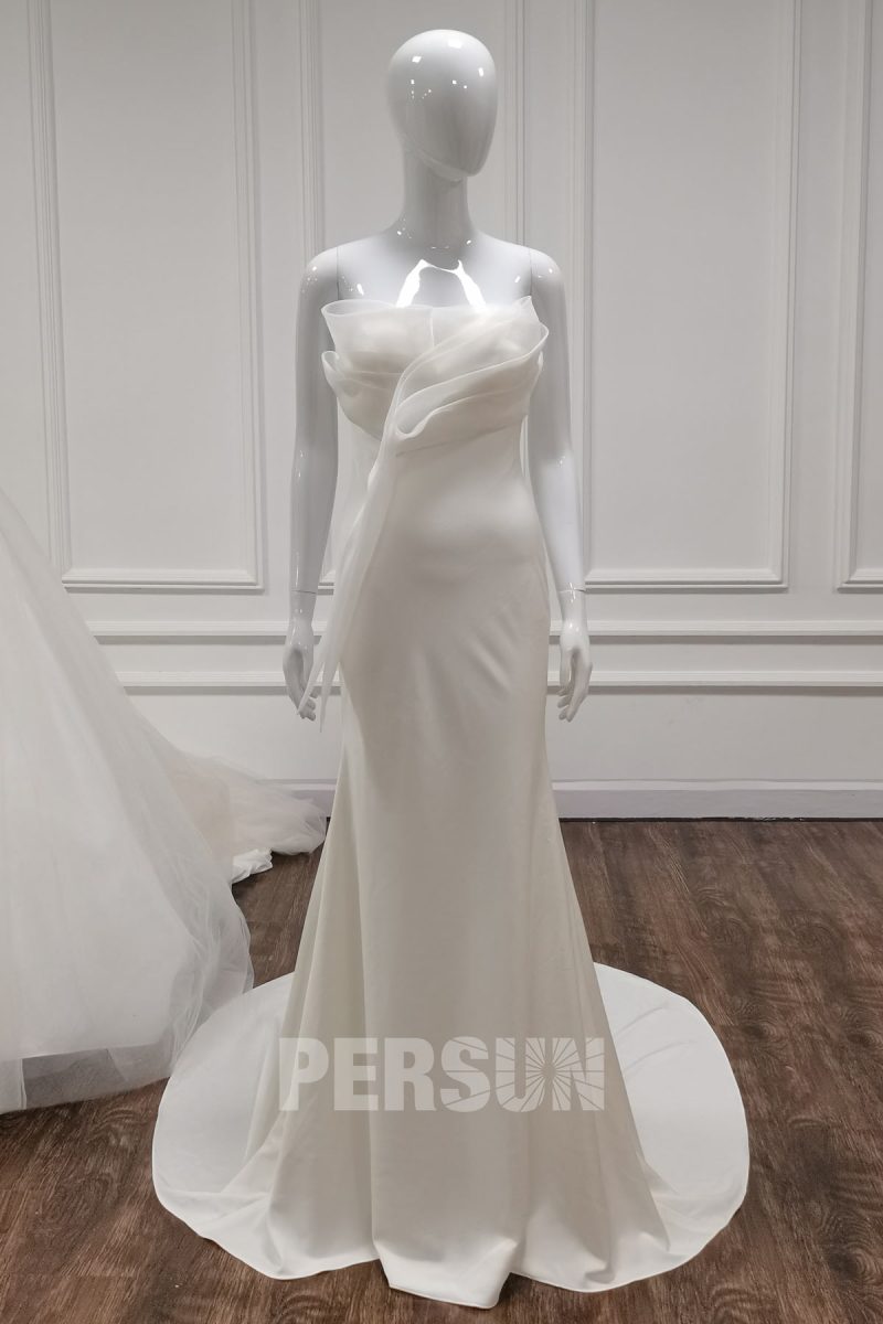 Si vous organisez une fête modeste dans le cercle de parents et d’amis proches dans un petit café, une robe moelleuse avec un train de 2 mètres y sera complètement inappropriée. Dans ce cas, vous feriez mieux de choisir une robe silhouette ou de regarder une version courte de la robe de mariée.